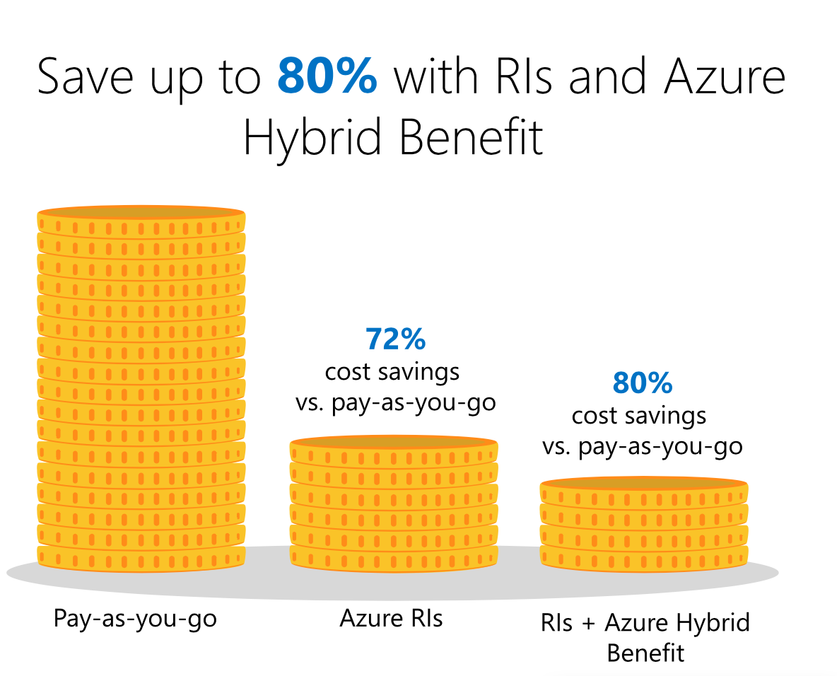 Microsoft reports a cost saving of up to 72% with Azure RI compared Azure Pay-as-you-go, and cost savings of up to 80% when combined with Azure Hybrid Benefit, which helps you save on your server licensing.